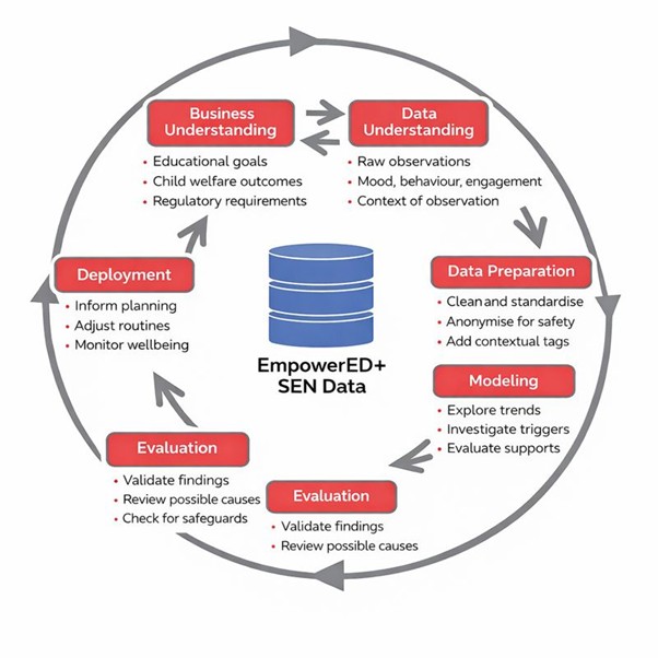 The EmpowerED+ system applies the CRISP DM process to transform SEN data into meaningful insight in a safe and ethical way. Educational and wellbeing goals guide data understanding, preparation, and modelling, where mood, behaviour, and engagement data are cleaned, contextualised, and analysed to identify patterns and effective supports. Findings are carefully evaluated with professional judgement and safeguarding in mind, then deployed to inform planning and monitor wellbeing in a continuous, iterative cycle.